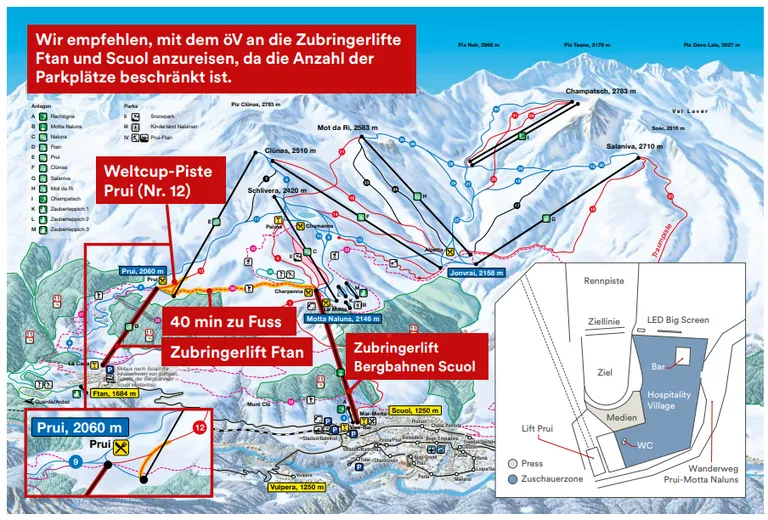 zu Fuss erreichst du das Zielgelände am einfachsten mit dem Zubringerlift Ftan. Eine zweite Option ist die Nutzung der Bergbahnen Motta Naluns und ein anschliessender 40-minütiger Fussmarsch zur Skipiste Prui und dem Hospitality-Village.